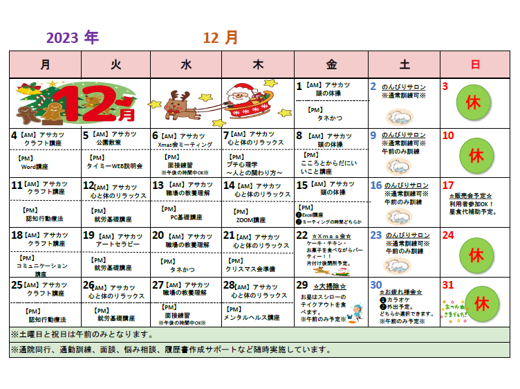 12月の行事・カレンダーです! 投稿日:2023-12-01 カレンダー クリックすると少しだけ拡大します ↓ 関連記事 2月のカレンダーです。 6月の講座・行事カレンダーです! 7月の講座・行事カレンダーです! 6月の講座・行事カレンダーです! 7月の講座・行事カレンダーです ! 9月の講座・行事カレンダーです! « 前のページへ次のページへ »